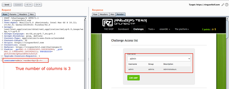 So let’s use burp suite to intercept the traffic and editing the parameter username by the injection payload admin’ and you will get a SQL error so it’s error based SQL injection, let’s count the number of columns by