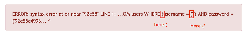 From the screenshot and the error the backend balancing the query by ending the query with ‘) characters so we’ll try to inject it with our payload, but wait and see the error again