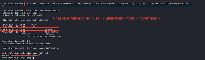 we found something runas.exe and after searching for it, I know that this program manages the administrator to run commands with administrator privileges without typing the password by using /savedcred which saves his credentials to the system
