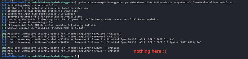 At the first, I used Windows Suggester to search for any vulnerabilities in the kernel which will manage me to get high privileges by getting the system info and checking it