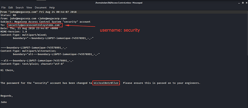 This is a mail from John to Security that informs him about the changes which happened to his account’s user, so we have the updated or the new username and the password. Let’s use these credentials to log in to the server using telnet