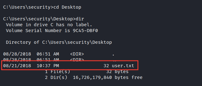 Good, now we’re inside the server but in security user not admin so let’s grab user.txt first