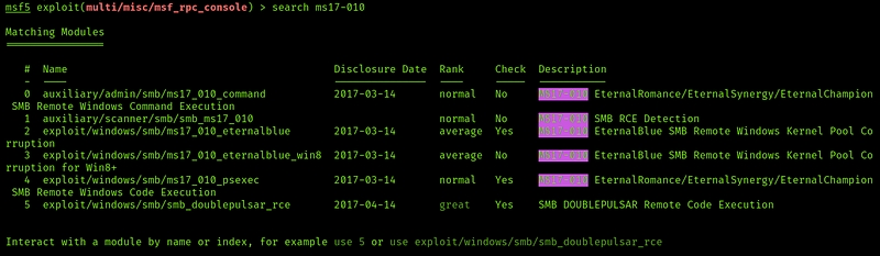 Now we know that itâs vulnerable by ms17â010, letâs search about it on metasploit