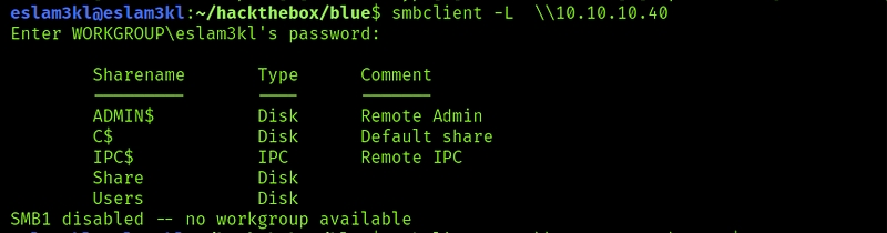 Nmap scan report for 10.10.10.40Host is up (0.17s latency).Not shown: 991 closed portsPORT STATE SERVICE VERSION135/tcp open msrpc Microsoft Windows RPC139/tcp open netbios-ssn Microsoft Windows netbios-ssn445/tcp open microsoft-ds Windows 7 Professional 7601 Service Pack 1 microsoft-ds (workgroup: WORKGROUP)49152/tcp open msrpc Microsoft Windows RPC49153/tcp open msrpc Microsoft Windows RPC49154/tcp open msrpc Microsoft Windows RPC49155/tcp open msrpc Microsoft Windows RPC49156/tcp open msrpc Microsoft Windows RPC49157/tcp open msrpc Microsoft Windows RPCService Info: Host: HARIS-PC; OS: Windows; CPE: cpe:/o:microsoft:windows