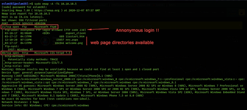 from the output, you should note that we have 2 ports open http(80) and ftp(21) and thereâs a dangerous thing Anonymous FTP login allowed