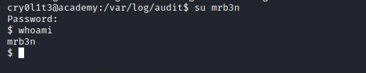 Let’s try to escalate our privileges again with searching for the users log in /var/log/audit