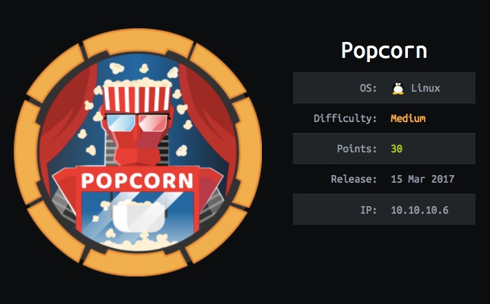 Hey Everyone! Today we have the first medium retired machine from Hack The Box, and it’s called PopCorn. Before we get started, let’s take a look at its info