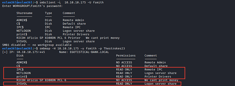 3. Let’s try to dump SMB shares by using smbclient and smbmap first to know fsmith permissionshas and we found that he have permission to read only 4 shares
