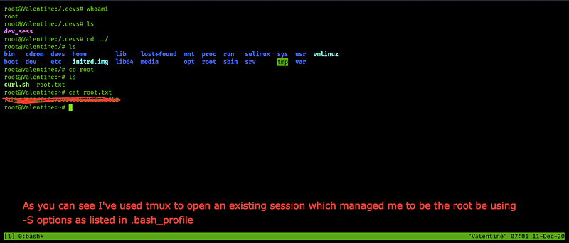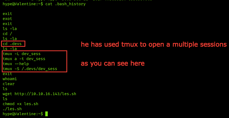 It’s used to open more than a session is the single terminal screen, so he used cd /.devs and then created one dev_sess so let’s use it and see its role and privileges by typing cd /.devs + tumx -S dev_sess and you will get the open session for the dev team