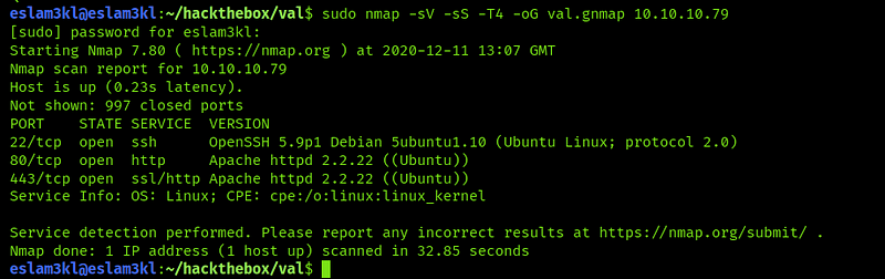 In this step we will scan the machine’s IP for open ports and service running on these ports nmap -sS -sV -T4 -oG val.gnmap 10.10.10.79 and as you can see we will generate gnmap to try brute-force the credentials if it’s available.