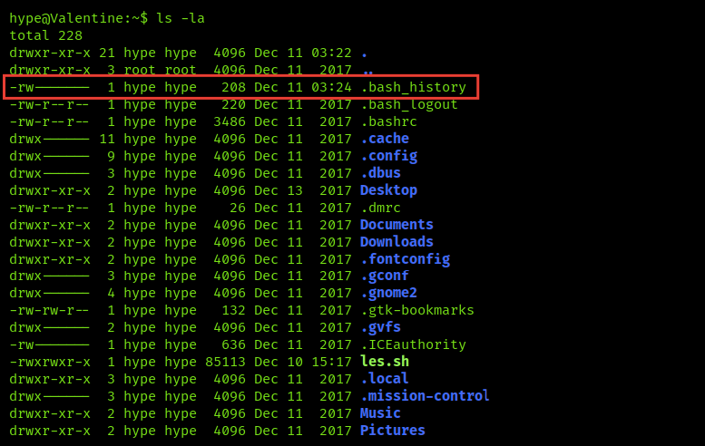 if you type ls -la you will find .bash_history and from this file, you can know the bash commands which the user typed so let’s try to look at it