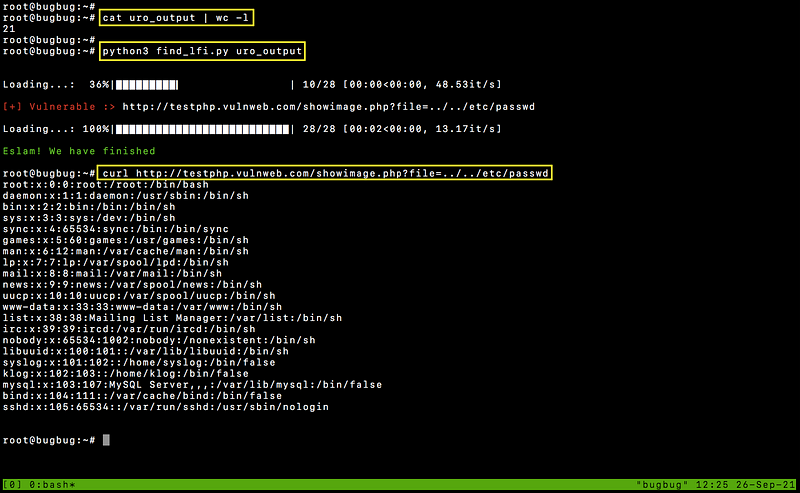 Letβs take a summary of what we have or what we have done, At first, we take a file of URLs with parameters and pass them to exurl a library that replaces every parameterβs value with the payload ../../../../etc/passwd